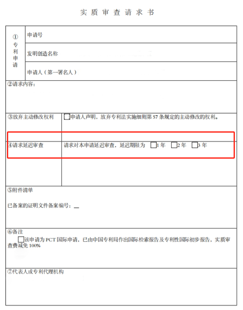 发明专利申请的“延迟审查”实行请求制,请求人需要在提交发明专利申请“实质审查请求书”时,在第④栏进行勾选。